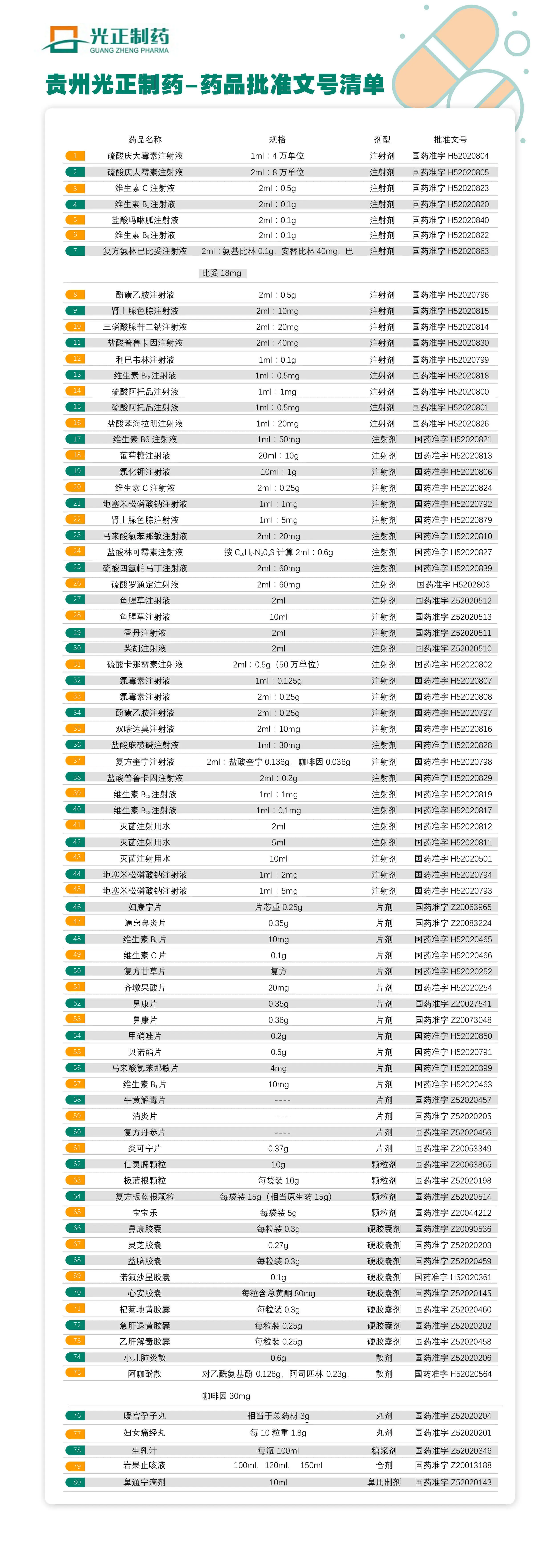 贵州光正制药-药品批准文号清单